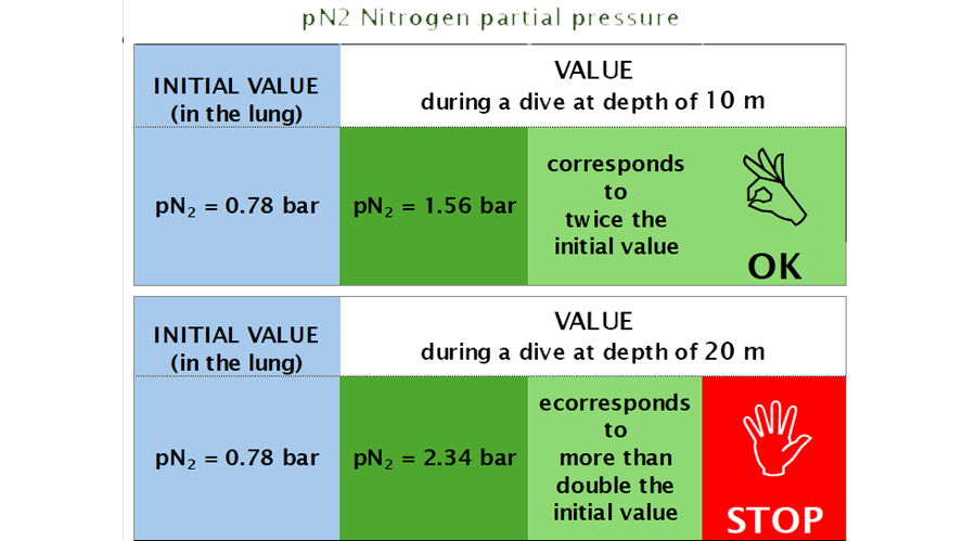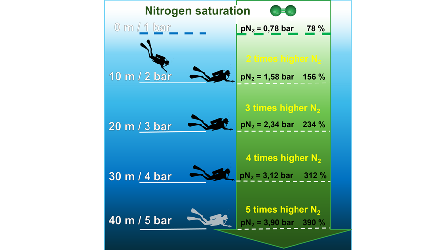 We know that nitrogen (N₂) makes up 78% of our breathing air and oxygen (O₂) makes up 21%. Together, that equals 100%. At the surface (sea level), the total pressure of the inhaled gas mixture is 1 bar.  Therefore, nitrogen has a partial pressure of 0.78 bar. As soon as we descend, the surrounding pressure increases with every meter of depth. At 10 meters, we have twice the amount of nitrogen. At 20 meters, three times as much, and so on. At the maximum recommended recreational diving depth of 40 meters, it is five times as much. Because we breathe compressed air underwater, we inhale more gas molecules with every breath. This process is called nitrogen saturation.