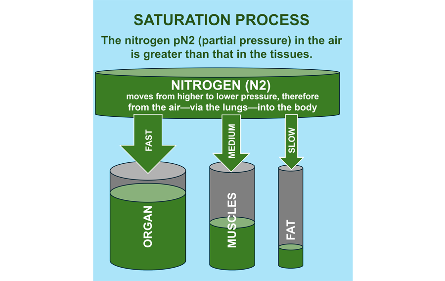 Complete nitrogen saturation is reached when the amount of nitrogen N₂ in the air breathed into the lungs is equal to the amount in the blood and affected tissues. The human body consists largely of water, which serves as a solvent for gases such as nitrogen. Under normal atmospheric conditions, i.e. on land, the amount of nitrogen N₂ dissolved in the body is low. When diving, the ambient pressure increases.  This allows more nitrogen N₂ to enter the bloodstream and be transported to the tissues via the blood circulation. Because our bodies have different types of tissue, these are divided into groups - known as compartments in technical terms - for the purpose of calculating nitrogen saturation. This is because the saturation of tissues occurs at different rates. The group with rapid saturation, taking only 5 to 10 minutes, includes the blood and organs (kidneys, liver, brain). The group with a medium saturation time, from 30 to 120 minutes, includes the skin and muscles. The group with slow saturation, from 2 to 5 hours, includes the joints, fatty tissue, and bones. Saturation is therefore a dynamic process that depends on ambient pressure, diving depth, duration of stay at depth, and the individual properties of the tissue.