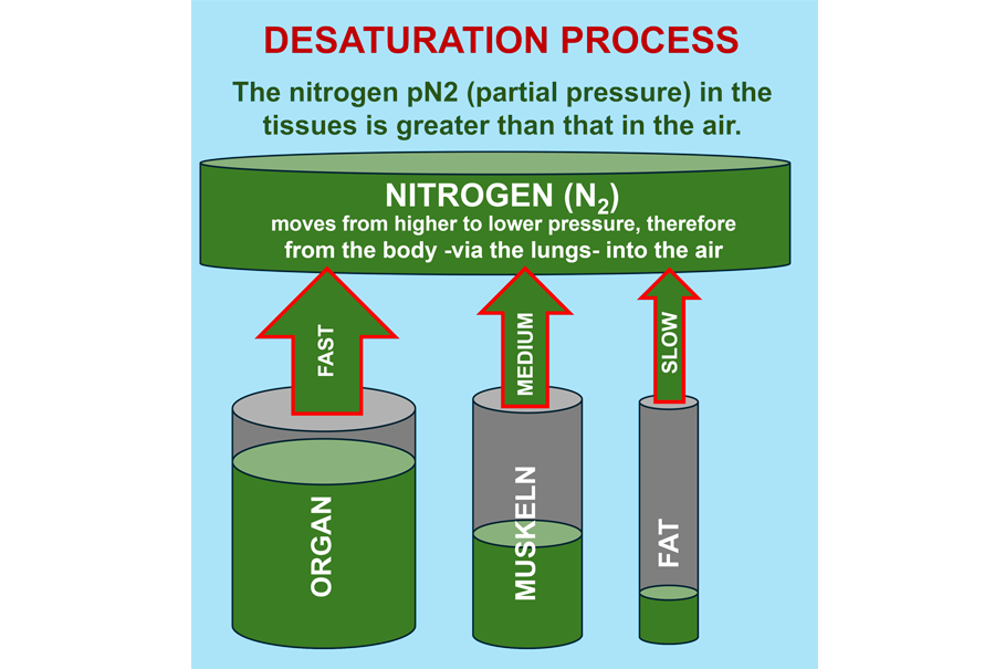As soon as we begin to end the dive, i.e., leave the depth and slowly ascend, the ambient pressure also changes. As a result, the partial pressure of nitrogen N₂ in the tissue cells is higher than that in the air we breathe. Consequently, nitrogen N₂ migrates from the tissue cells via the bloodstream to the lungs and from there into the exhaled air. This process is called desaturation.